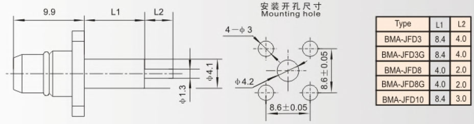 BMA系列产品是国际上这几年才发展起来的一种配的新型射频同轴连接器。可用于各种微波电路的连接,尤其适用于机箱、机柜的高密合,有利于雷达等整机系统的模块化。BMA系列产品从结构尺寸上讲是SMA系列的推入式变形;接口采用的是空气界面,使用频率达18GHz。他的优点是:体积小、接触可靠、机械电气性能优越,对接方便等。近年来,在国内外已得到了越来越广泛的应用.